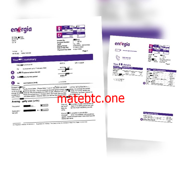 9、欧盟爱尔兰电费账单Ireland Electricity bill(欧盟地址证明)注:需提供英文姓名+英文地址